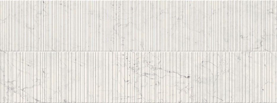 Одним из главных преимуществ этой плитки является ее уникальный рисунок в виде полос, который создает иллюзию движения и динамики на стенах. Этот эффект усиливается благодаря рельефной текстуре, которая имитирует мрамор, добавляя пространству глубины и объема. Белый цвет плитки делает ее идеальным выбором для создания светлых и просторных интерьеров, придавая помещению ощущение чистоты и уюта.