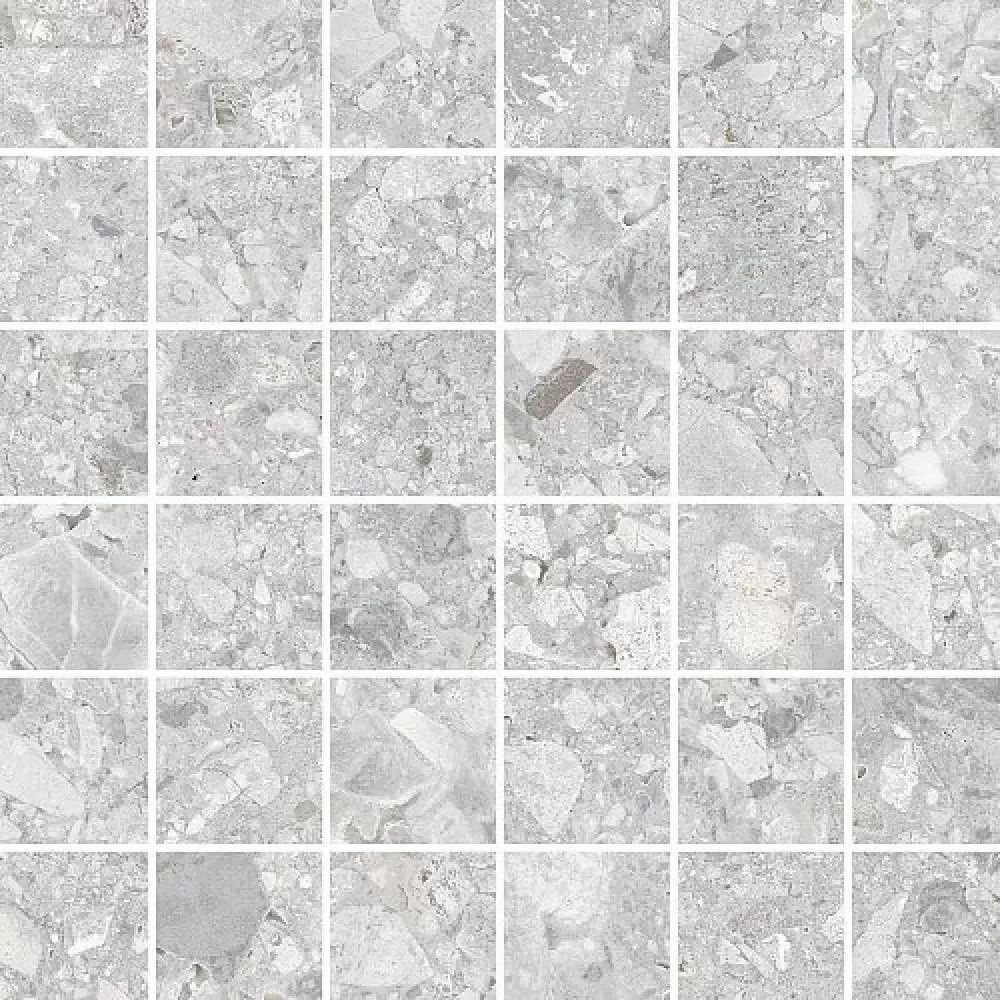 Плитка Vitra Ceppostone представляет собой квадратные элементы размером 30×30 см, что делает ее идеальным выбором как для напольного, так и для настенного покрытия. Ее мелкий формат 5х5 см создает эффект мозаики, придавая поверхности уникальный и изысканный вид. Серый матовый цвет плитки, близкий к светлому оттенку, создает атмосферу спокойствия и уюта, а ректифицированная фактура обеспечивает идеально ровные швы и легкость укладки.