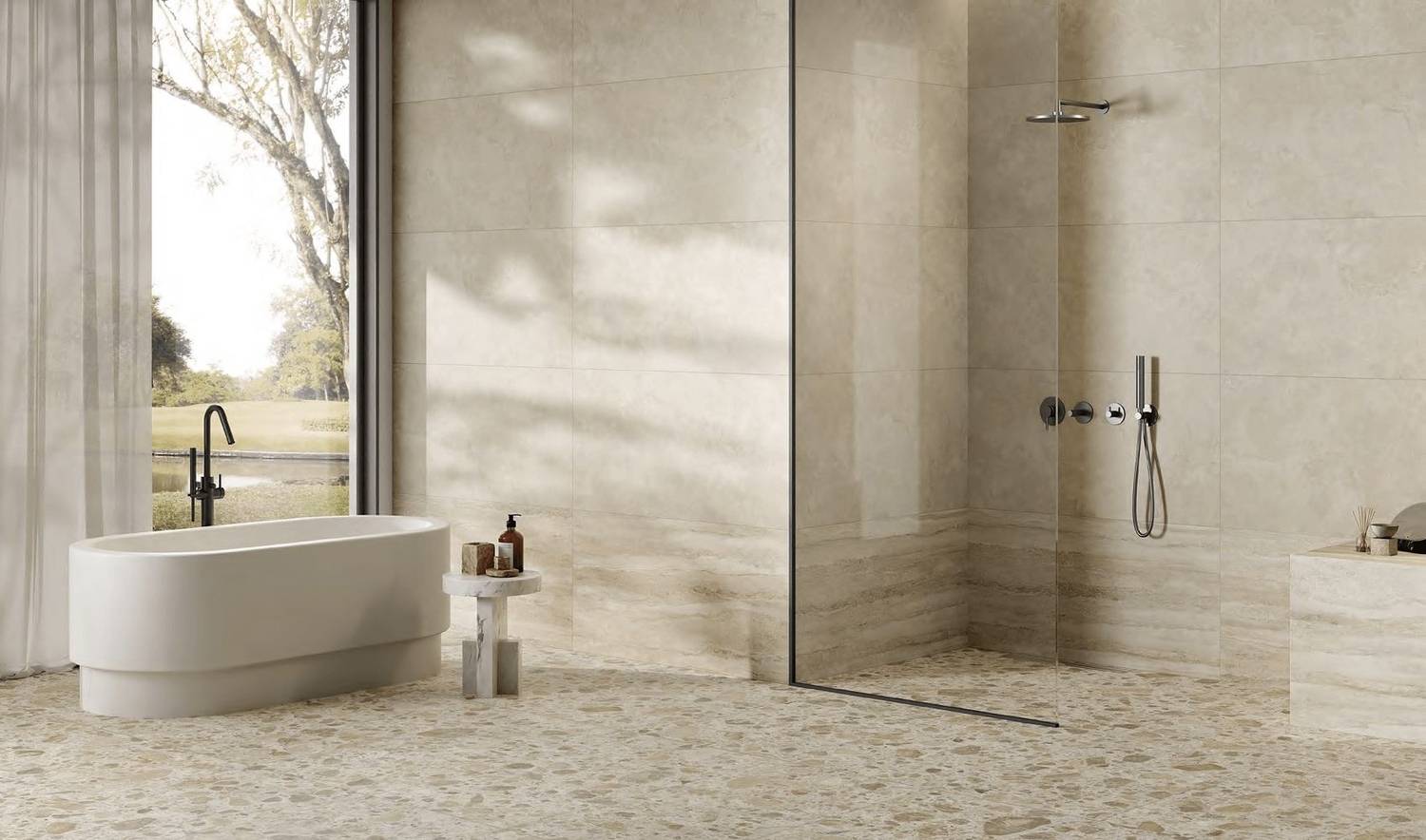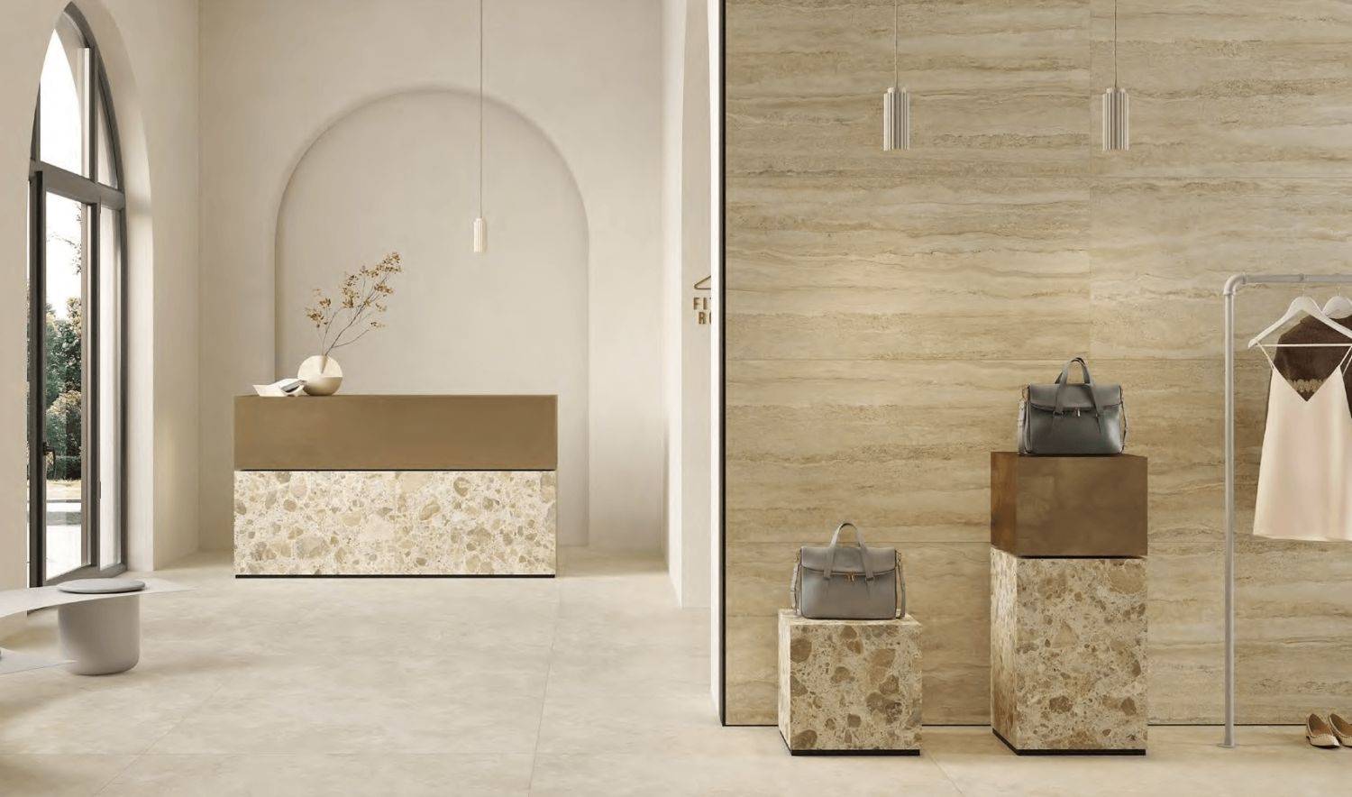 Текстура плитки имитирует натуральный травертин, что придает интерьеру особый шарм и теплоту. Этот материал, часто используемый в классических интерьерах, здесь получает новую жизнь, сочетаясь с современными тенденциями. Ощущение гладкости и приятности на ощупь делает ее не только красивой, но и комфортной в использовании.