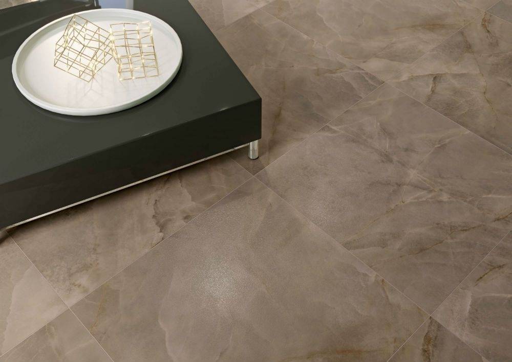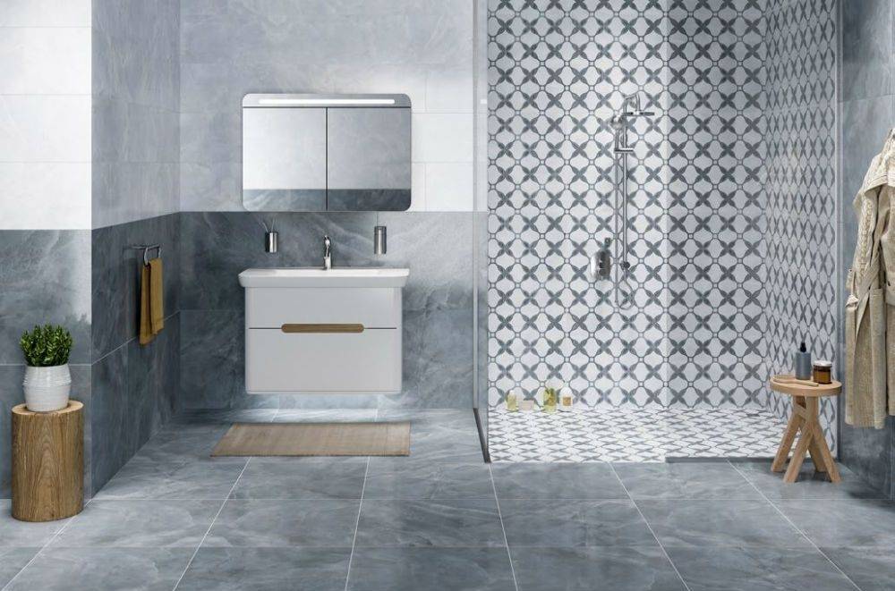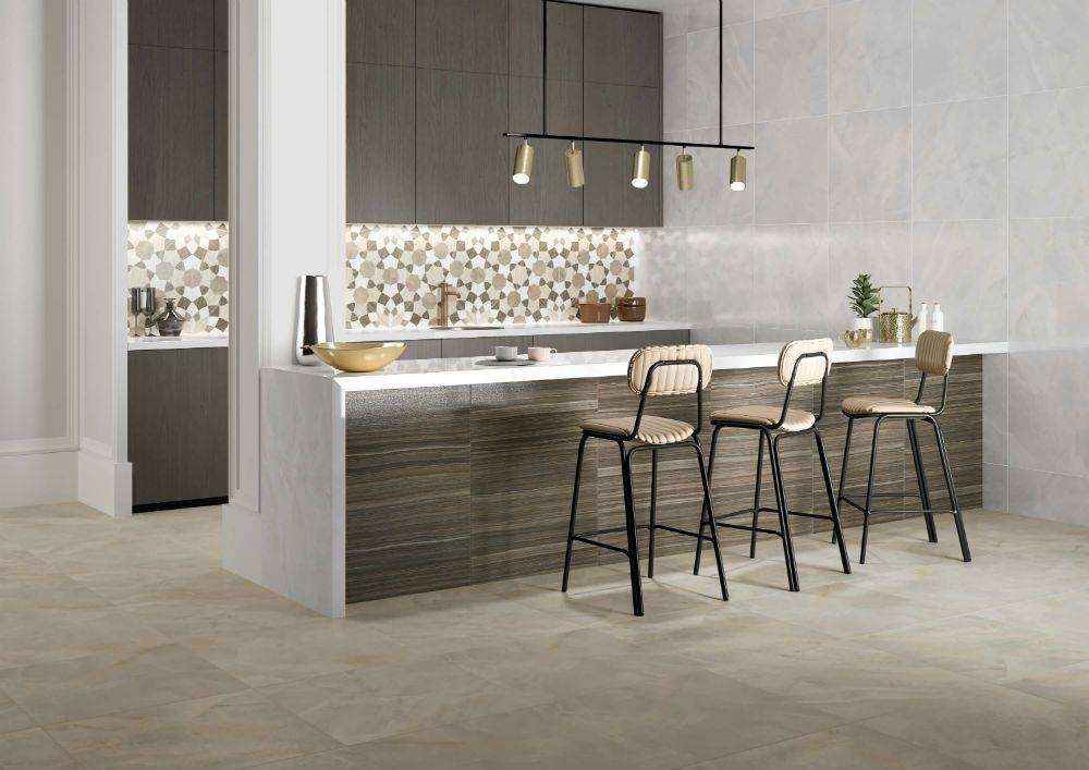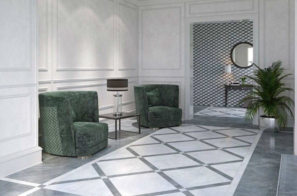 Особенно привлекательным является рисунок плитки, который представляет собой сложный орнамент с геометрическими элементами. Этот декор придает интерьеру динамику и современность, создавая ощущение движения и гармонии. Фактура лаппатированная и ректифицированная, что придает поверхности гладкость и благородный блеск, подчеркивая естественную текстуру под камень.